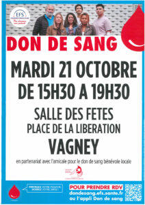 <div style="height: 100%;" class="synbird-widget" data-id-professional-company="2157" data-script-id="3600" data-square-button=false></div><script type="text/javascript" src="https://widgets.synbird.com/userWidget.js" defer="defer"></script></div></div> Date 21/10/2025 Heure 15 h 30 min - 19 h 30 min Don du sang Partagez cet événement + Ajouter à mon Agenda Google + iCal / Outlook export 00 jours 00 heures 00 minutes 00 secondes