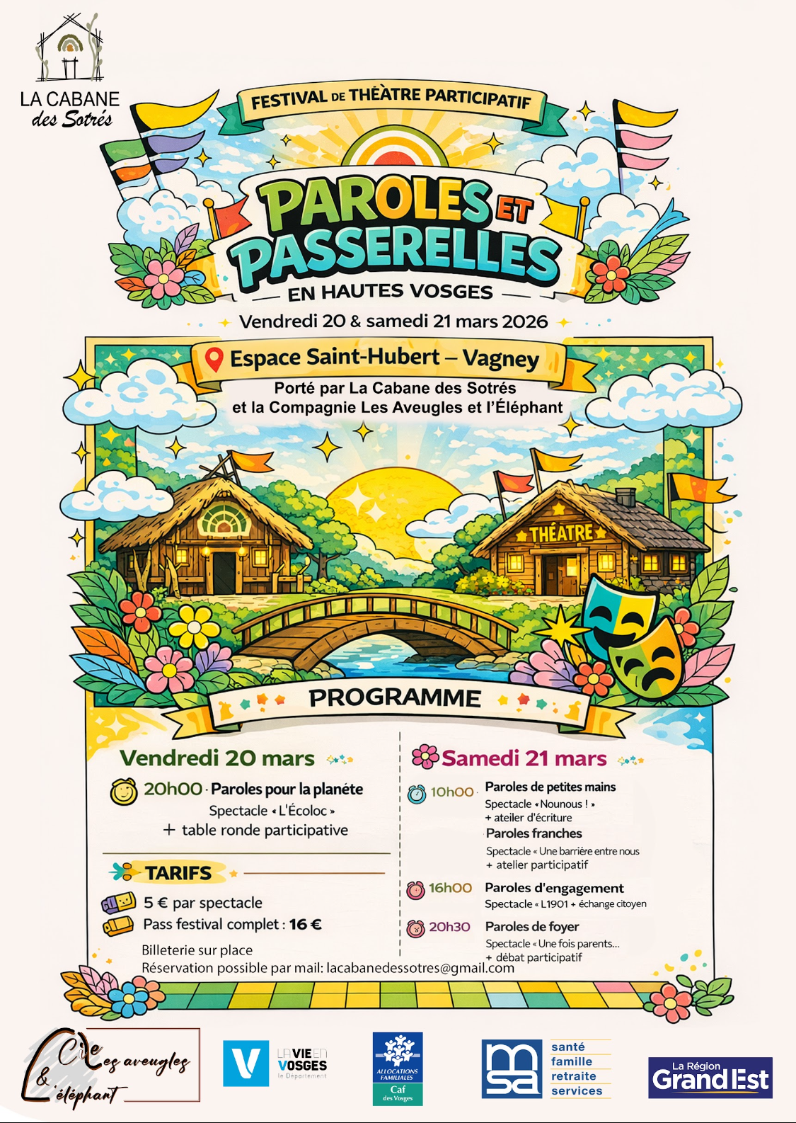 <div style="height: 100%;" class="synbird-widget" data-id-professional-company="2157" data-script-id="3600" data-square-button=false></div><script type="text/javascript" src="https://widgets.synbird.com/userWidget.js" defer="defer"></script></div></div> Date 20 - 21/03/2026 Heure Journée entière Festival de théâtre – La Cabane des Sotrés Partagez cet événement + Ajouter à mon Agenda Google + iCal / Outlook export 00 jours 00 heures 00 minutes 00 secondes