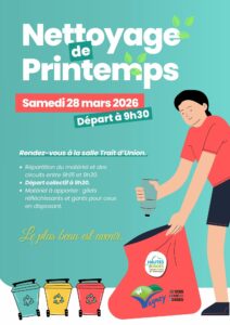 <div style="height: 100%;" class="synbird-widget" data-id-professional-company="2157" data-script-id="3600" data-square-button=false></div><script type="text/javascript" src="https://widgets.synbird.com/userWidget.js" defer="defer"></script></div></div> Date 28/03/2026 Heure 9 h 15 min - 11 h 30 min Nettoyage de printemps Partagez cet événement + Ajouter à mon Agenda Google + iCal / Outlook export 00 jours 00 heures 00 minutes 00 secondes