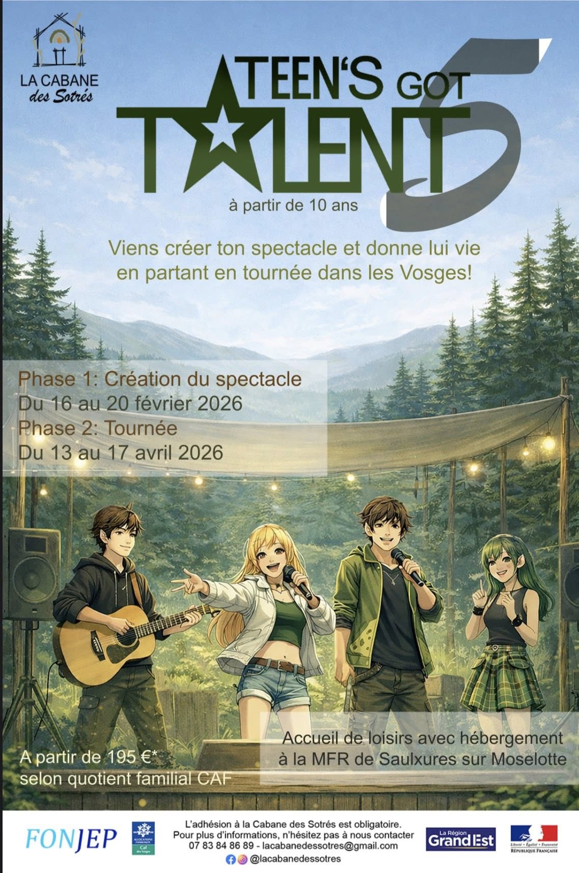 Screenshot <div style="height: 100%;" class="synbird-widget" data-id-professional-company="2157" data-script-id="3600" data-square-button=false></div><script type="text/javascript" src="https://widgets.synbird.com/userWidget.js" defer="defer"></script></div></div> Date 16 - 20/02/2026 Heure Journée entière Teen’s got talent Screenshot Partagez cet événement + Ajouter à mon Agenda Google + iCal / Outlook export 00 jours 00 heures 00 minutes 00 secondes