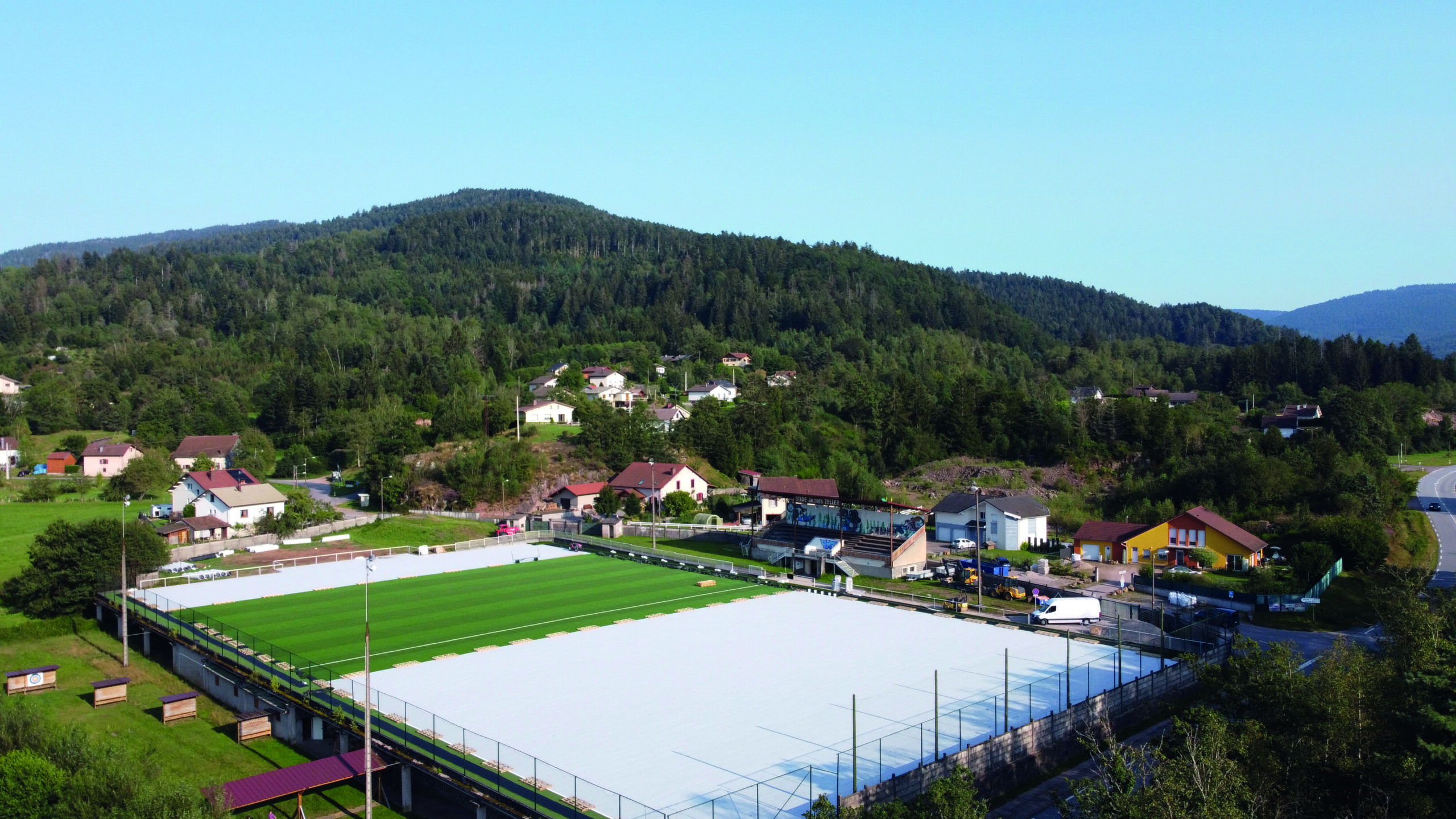 Après 24 années d’utilisation par l’AS Vagney, la pelouse du stade Zeller a été remplacée par un gazon synthétique, écologique et durable. Les travaux comprenaient le terrassement et la pose d’un système de drainage, d’une sous-couche amortissante de 6000m² et d’un bac de récupération et d’infiltration des eaux pluviales de 120m³. De nouveaux équipements, tels que six buts et quatre projecteurs LED, ont complété l’installation.