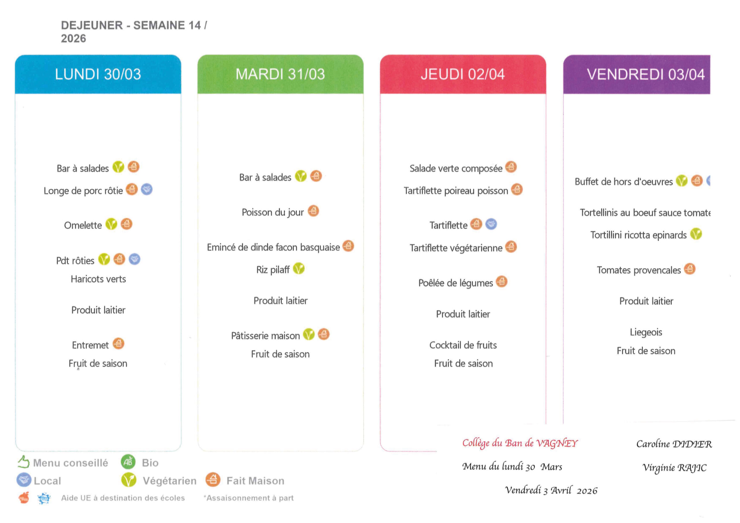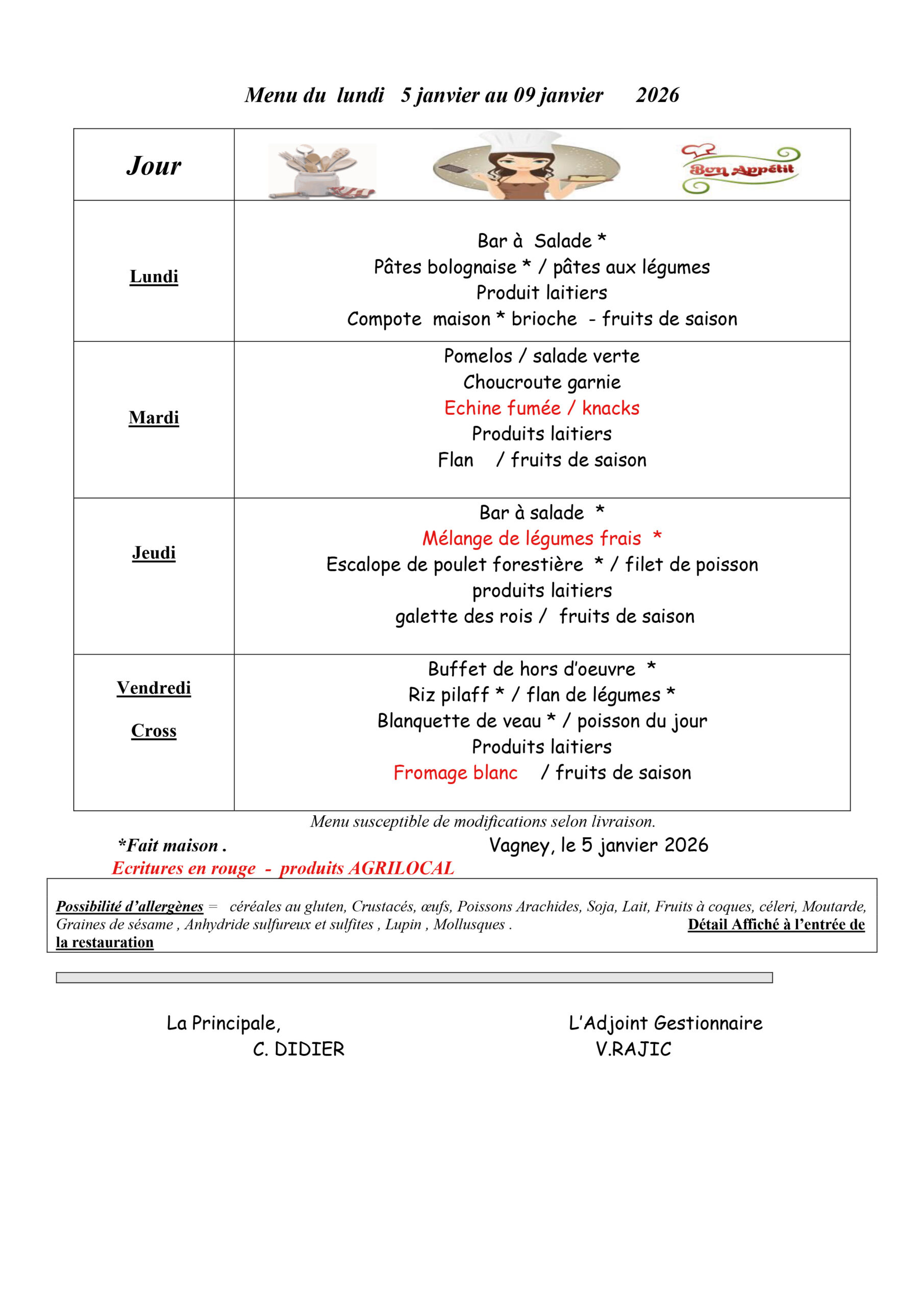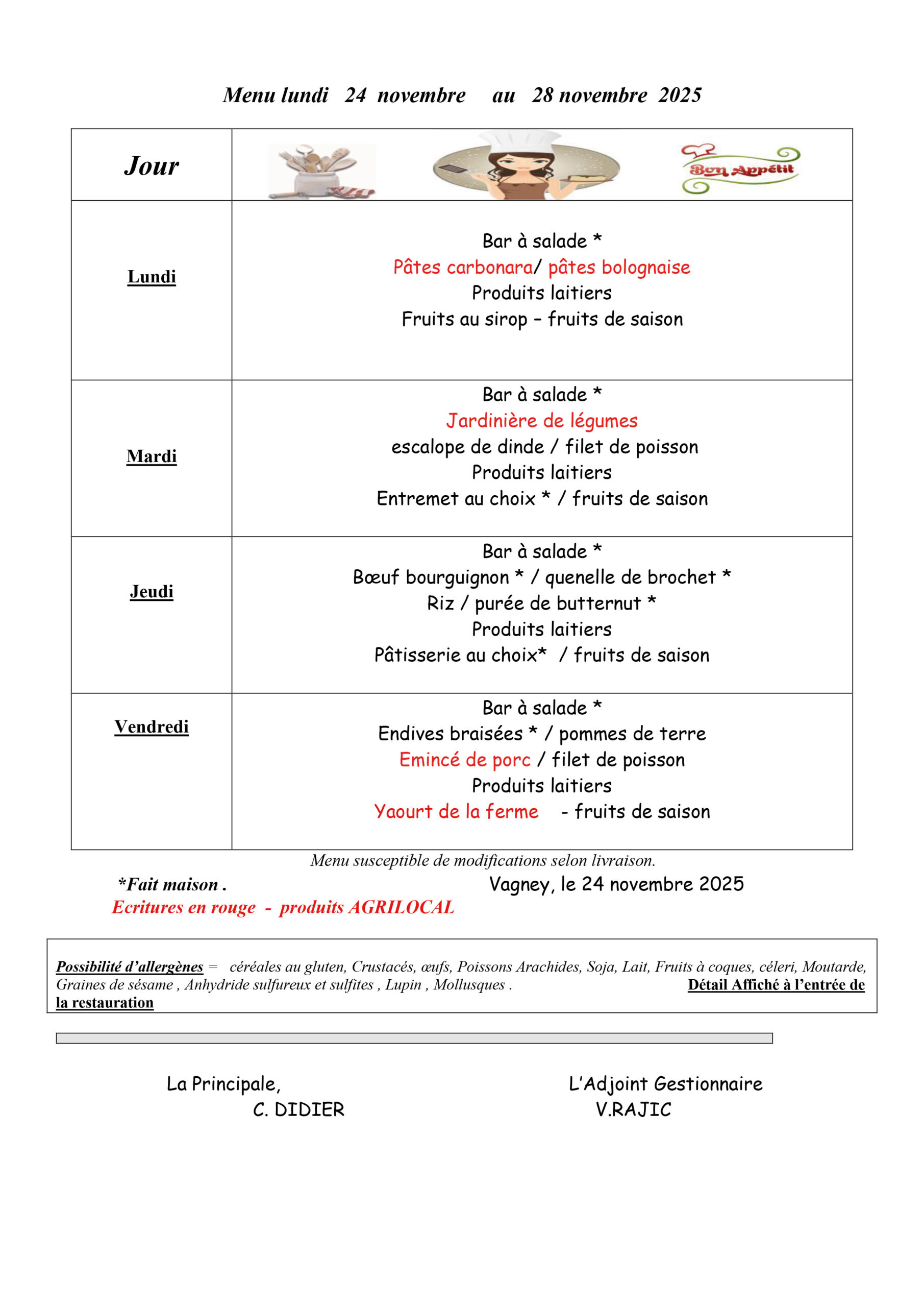 Les menus de la cantine